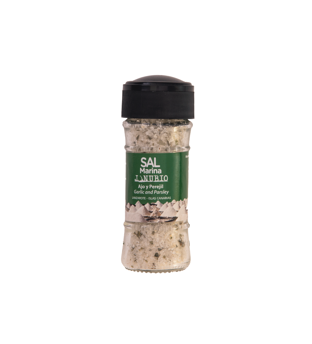 Recolectada artesanalmente en Lanzarote, la sal marina de Janubio es conocida por su pureza y alto contenido en minerales, mientras que el ajo y el perejil le aportan un toque aromático que complementa a la perfección diversas preparaciones culinarias.